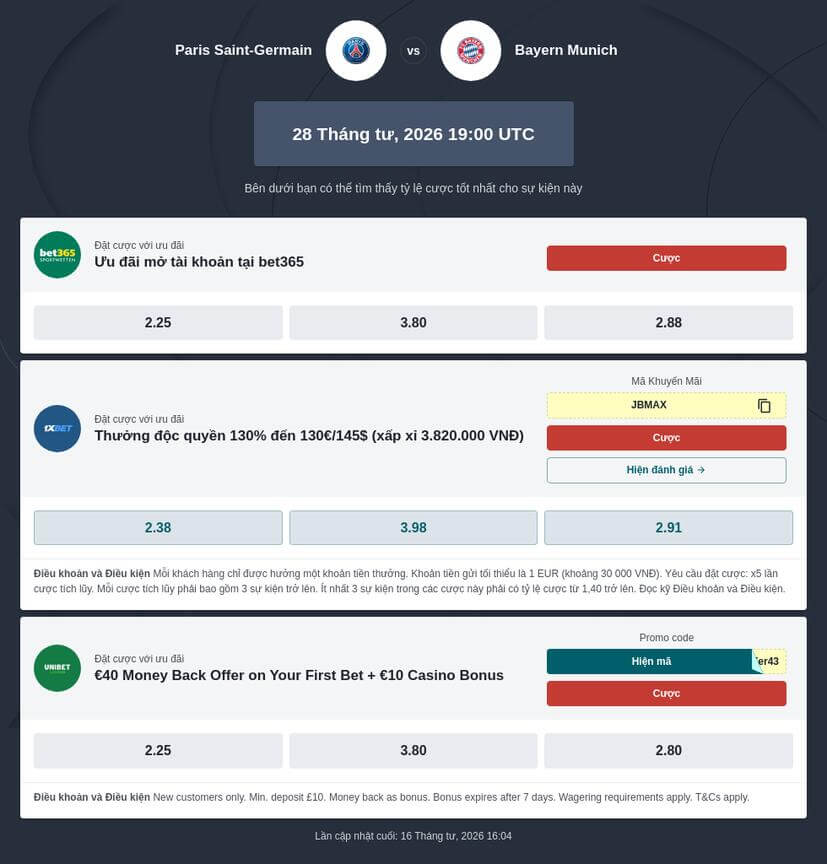 Paris Saint-Germain vs Bayern Munich - Tỷ lệ cược tốt nhất