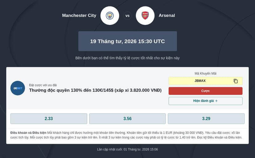 Manchester City vs Arsenal - Tỷ lệ cược tốt nhất