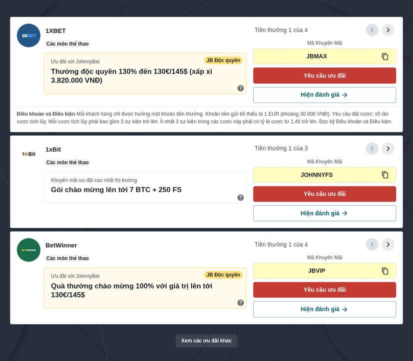 Săn mã tiền thưởng: Luôn theo dõi cộng đồng JohnnyBet để lấy mã khuyến mãi độc quyền. Đây là cách chắc chắn nhất để nhận thêm nhiều hơn giá trị thưởng tiêu chuẩn tại nhà cái. Ví dụ chi tiết tại Đánh giá mã khuyến mãi Betwinner!