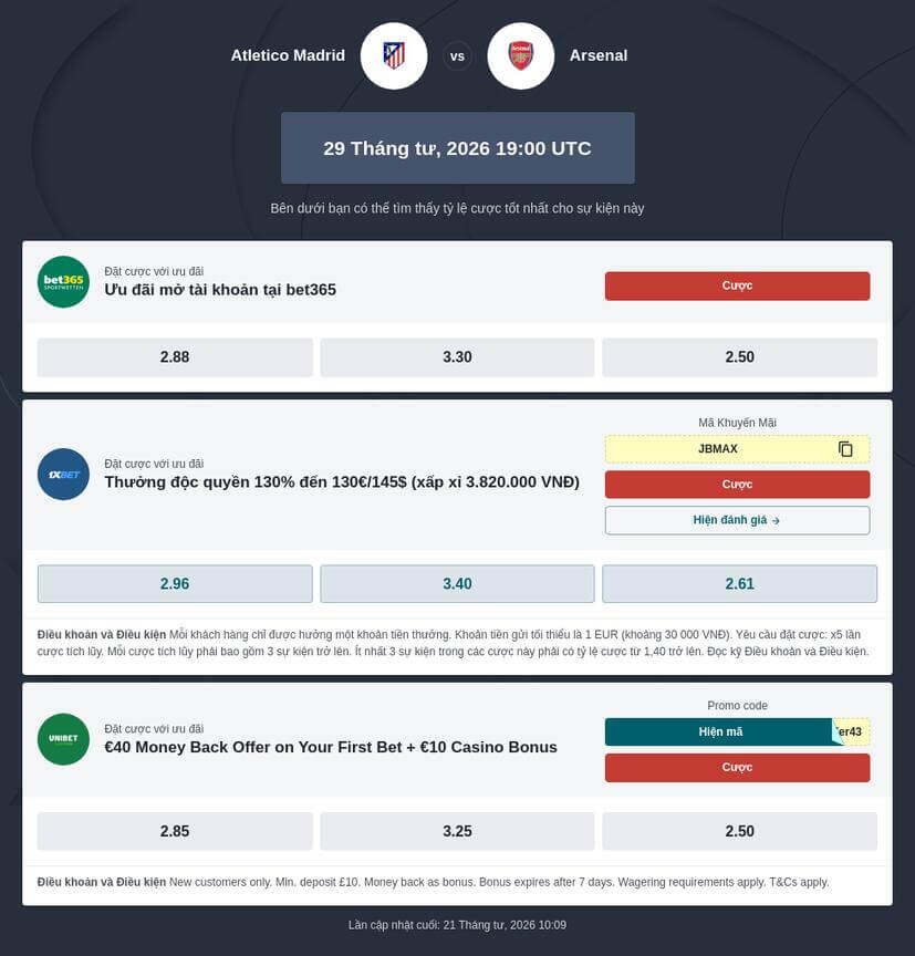Hiện tại, 1XBET và 888starz đang cung cấp Tỷ lệ cược C1 lượt đi Atletico Madrid đấu với Arsenal mức ăn cao nhất cho thị trường 1X2 và Handicap của trận đấu này, giúp người chơi tối đa hóa tiền thưởng khi dự đoán đúng.