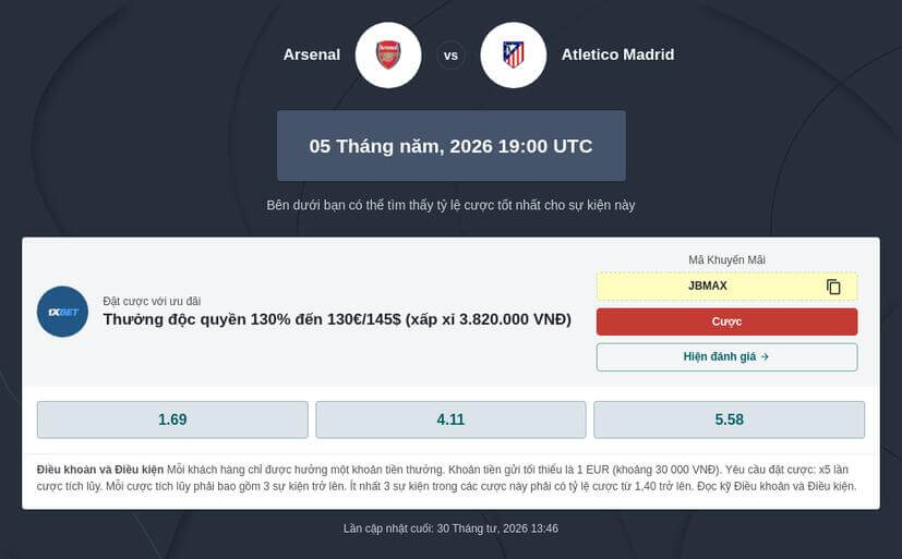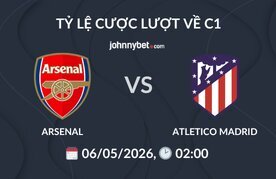Tỷ lệ cược C1 lượt về Arsenal đấu với Atletico Madrid: Arsenal thắng (1.69), hòa (4.11), Atletico Madrid thắng (5.58).Trận đấu sẽ diễn ra vào lúc 02:00 ngày 06/05/2026 tại sân vận động Sân vận động Emirates. Cùng phân tích sâu các chỉ số từ nhà cái để tìm ra lựa chọn đầu tư thông minh nhất cho cuộc đối đầu đỉnh cao này.