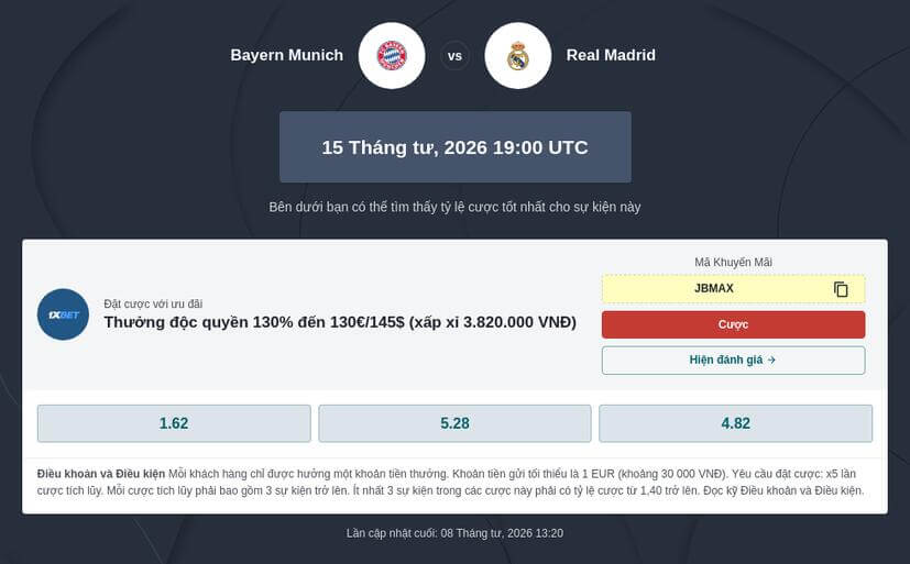 Bayern Munich vs Real Madrid - Tỷ lệ cược tốt nhất
