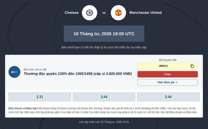 Tỷ lệ cược Ngoại Hạng Anh Chelsea đấu với Man Utd
